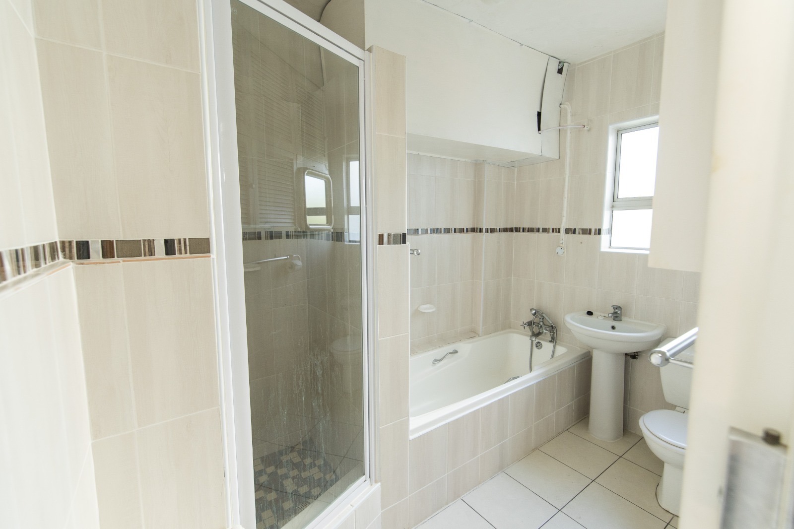 This 2-bedroom unit boasts an open-plan dining and living room, a kitchen with ample cupboard space, and a bathroom with both shower and bath.