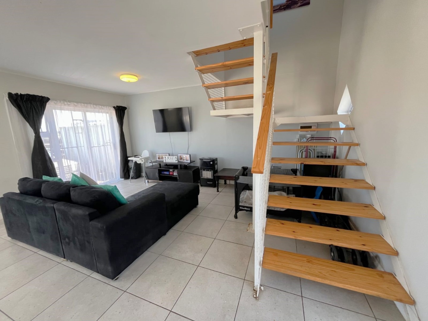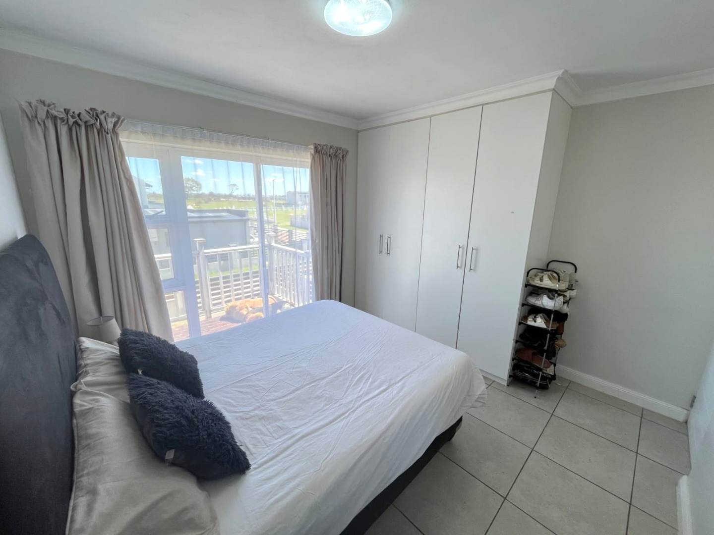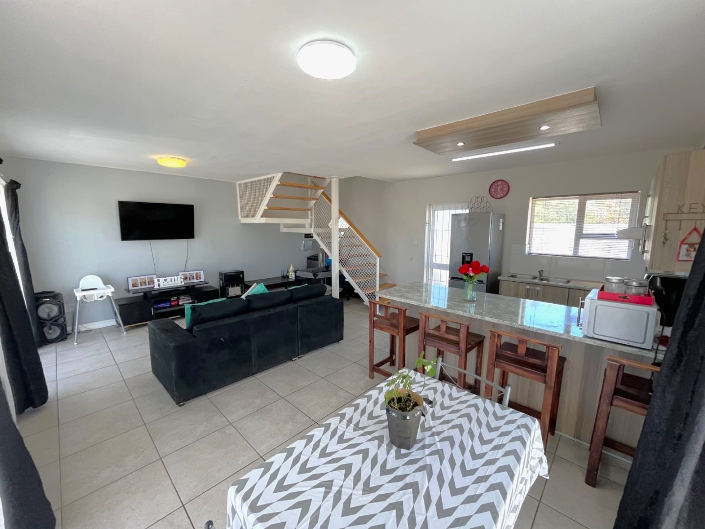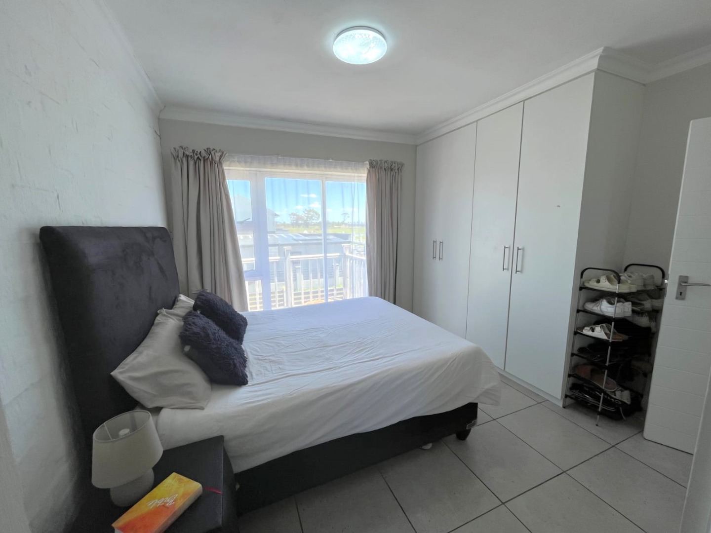 The property features two well-sized bedrooms with built-in cupboards, including a main bedroom with en-suite and balcony with stunning views. You will also find a bathroom fitted with a shower for added convenience Upstairs.
